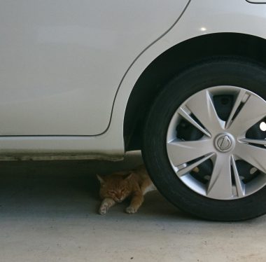 8月の暑い朝に社用車の下で、くつろいでいる近所のネコちゃん。