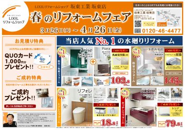 坂東店では明日3月26日(火)~4月26日(金)の期間中に リフォームのご相談をいただきますと、
