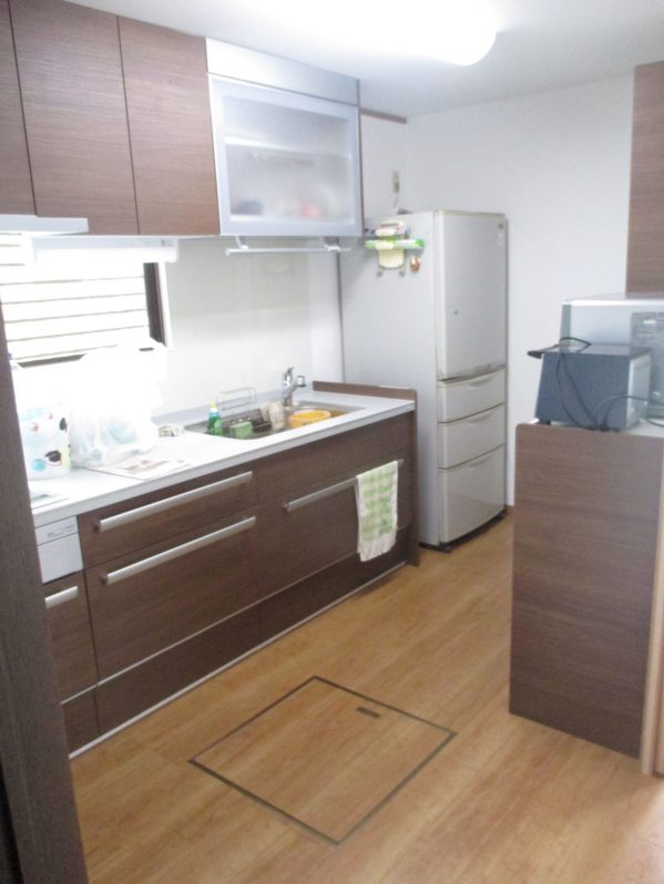 施工内容は、システムキッチン入れ替え、カップボード新設、LDKフロア上張貼り、電気配線、分電盤交換、設備配管改修、木製建具改修、内装クロスそして洗面室棚の新設でした。