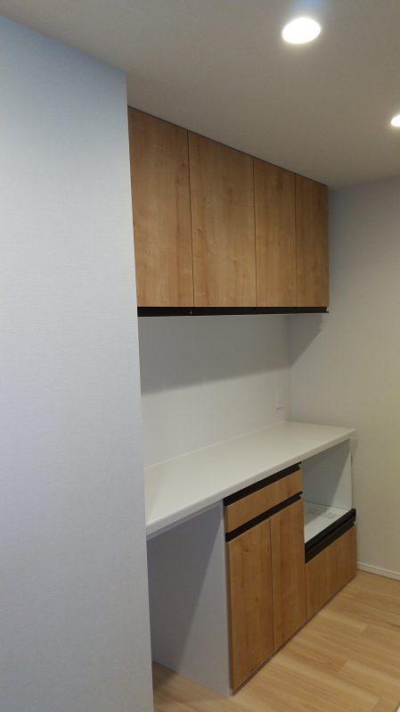 引き出し、 家電収納、吊り戸棚をご採用いただき、吊り戸は、