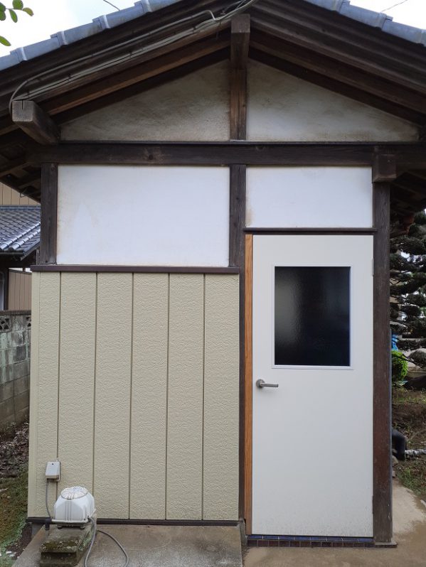 外でお仕事をされているので、外のトイレが必要アイテムなお施主様です。古くなったこと、出入口に扉がないので砂ぼこりが入ってしまいお掃除が大変なこと、冬は寒いことがお悩みでした。とても便利なので、まだまだ使いたいというお施主様のご要望にお応えできるようリフォームしました。ドアを新設し、外壁のサイディングを張替え、小便器と便器、手洗い器を交換しました。外なので冬は手洗い器の水道が凍ってしまうというお悩みもありましたが、断熱材を使用し扉もつけたので解消されると思います。