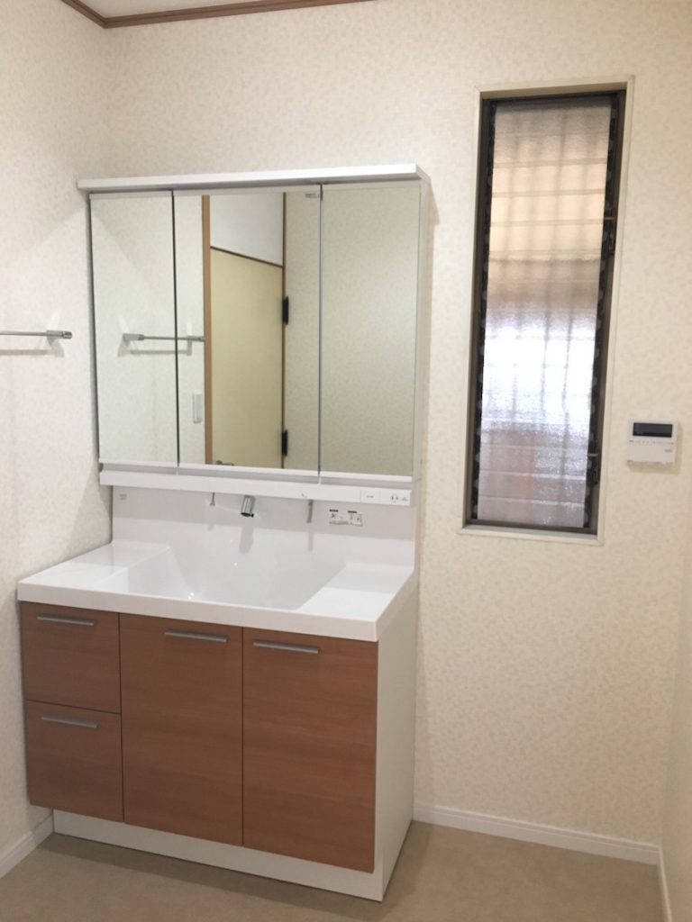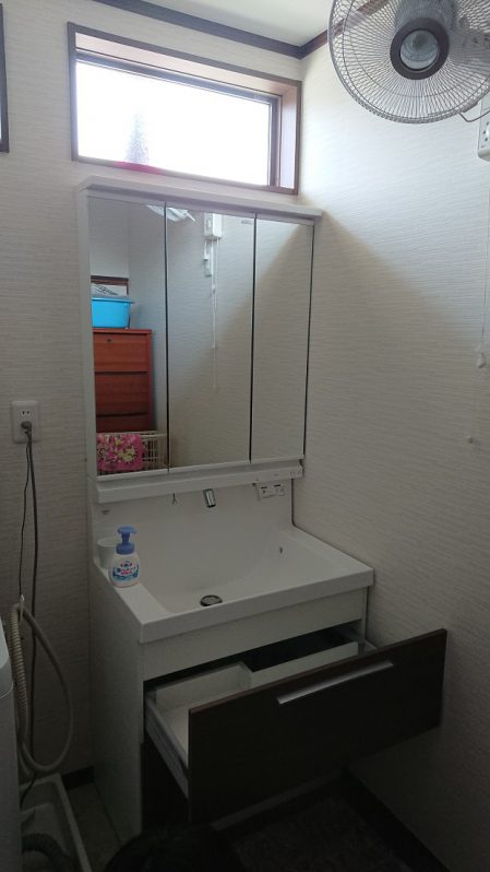 真夏はとても暑くて洗面脱衣室にも扇風機がついているお宅なので、内装工事は壁、床、天井の貼替えだけではなく、洗面室丸ごと断熱リフォームを行いました。洗面化粧台はLIXILのLCを採用しています。また、洗面化粧台の上に明かり取りの窓を新設し昼間は電気をつけなくても鏡が見やすくなるように工夫しました。明かり取りの窓はLIXILの断熱窓サーモスHを採用しています。断熱効果のある洗面脱衣室に変身したので、夏はお風呂上りの暑さの軽減と、冬は浴室との寒暖差の軽減を実感していただけます。とても暑かった洗面脱衣室が一年中快適な場所に生まれ変わりました。