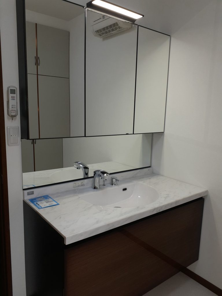 がリラックスを実現してくれてストレスを解消!!一日の疲れを癒してくれますね。お家時間が楽しみになるお風呂です。また、浴室のリフォームと一緒に洗面脱衣室もリフォームしました。洗面化粧台はLIXILのルミシスをお選びいただきました。人造大理石のカウンターと扉のお色の相性がよく、とても素敵に仕上がりました。