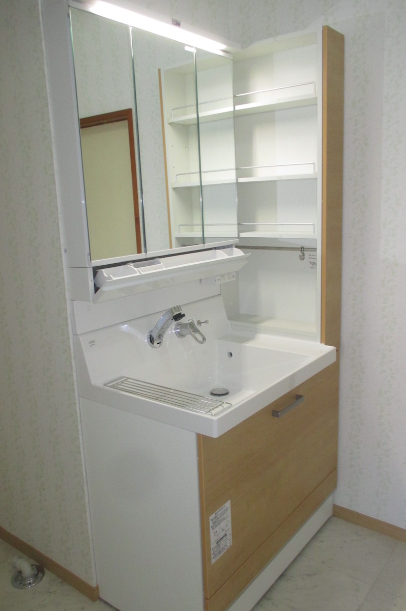 洗面化粧台の交換、床・壁のクロスの貼り替えを行いました。